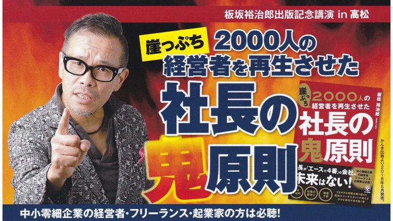 中小零細企業の経営者・フリーランス・起業家の方は必聴!小さな会社の勝ち方、生き残り方。 発売1ヶ月で4刷14,000部突破!! 話題の新刊『2000人の崖っぷち経営者を再生させた 社長の鬼原則 … 続きを読む 9/7 板坂裕治郎『2000人の崖っぷち経営者を再生させた 社長の鬼原則 』出版記念講演 in高松